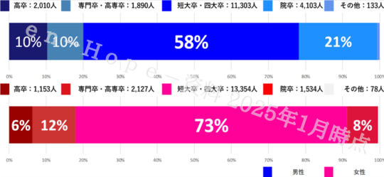 男性・女性ともに約80%が大学卒以上となっています。 また、そのうち男性の20%、女性の9%は大学院卒の学歴があります。関東県内の結婚相談所所属の会員の最終学歴は、高いということがわかります。