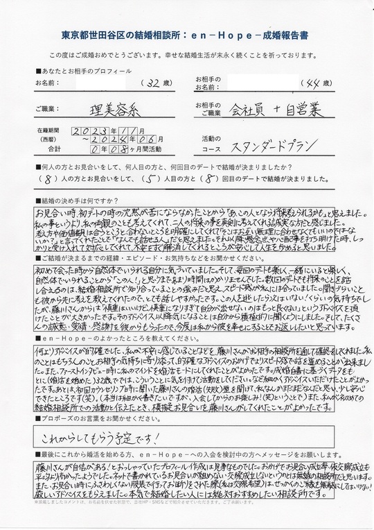 何よりアドバイスが的確でした、私が不安に感じていることなどを、藤川さんがお相手の相談所を通して確認をしてくれました。