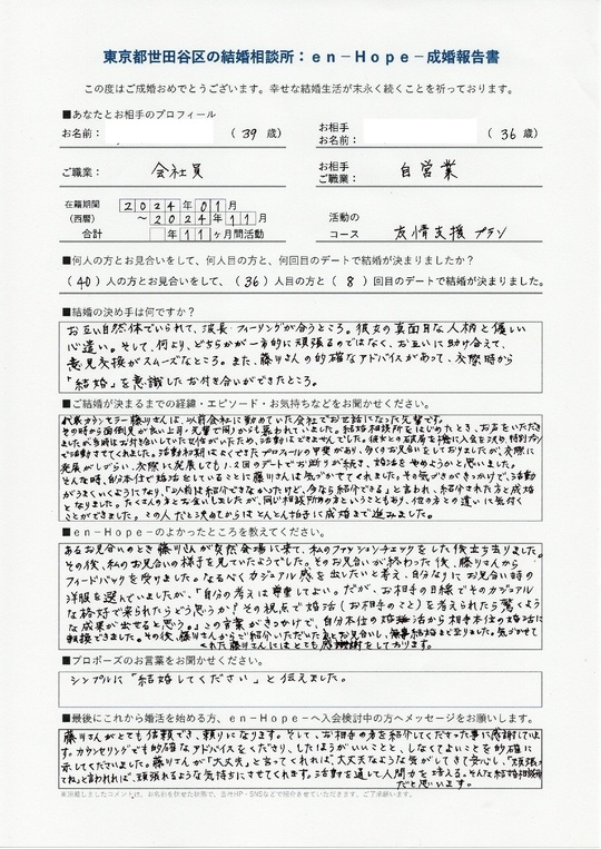 ご紹介したりーちゃん(仮名)は絶対に相性がいいものの、心の底からお勧めできる会員様になるまでは紹介しないと私が決めていたので、タイミングが遅くなり、結果活動期間も長くなりました。ただ、結果的に人間力を培ってくれたたっくんであれば、今後は2人で幸せに暮らしていけると確信しています。