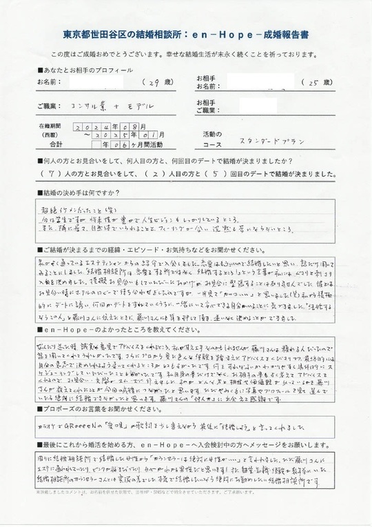 私自身の事だけでなく、お相手の事もよく考えてアドバイスをくれるので、お見合い・交際がスムーズに行えました。私がどんな方と相性や価値観があっているかを藤川さんが教えてくれたことが今回の成婚につながったと思います。