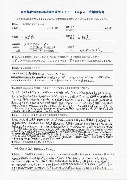 ほかの結婚相談所でうまくいかないとき「en-Hope-で活動したらうまくいきますか?」と聞いたら、「同じことをしたら同じ結果になる。自分を変えられるなら全力でサポートします。出来ないなら他をあたってください」といわれた。私のことを思い、そこまで言ってくれた人は初めてだった。