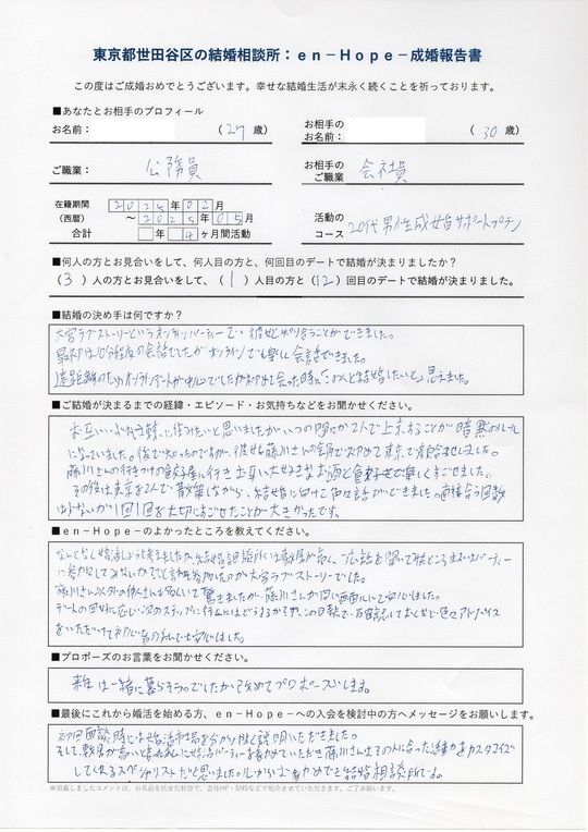 そして、敷居が高いと言った私に婚活パーティを勧めていただき、藤川さんはその人それぞれに合った活動をカスタマイズしてくれるスペシャリストだと思いました。心からお勧めできる結婚相談所です。