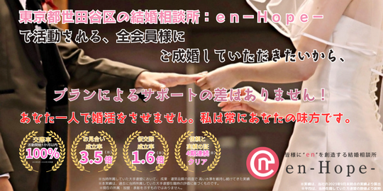 東京都世田谷区の結婚相談所en-Hope-さらに信頼されている結婚相談所であることが証明されました。私たちは常に会員様に対して誠実に向き合い、最高のサポートを提供することを約束しています。
