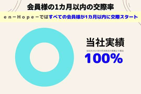 当社は100%の方が30日以内にお見合い成立しています。(※2025年4月時点)この高いお見合い成立率は、会員様一人一人に合わせた最適なマッチングと、経験豊富なカウンセラーによるサポートがあってこそ成し遂げられたものです。